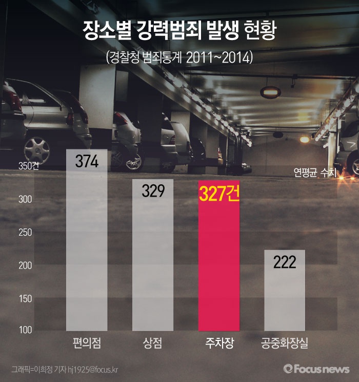 (서울=포커스뉴스) 통계청에 수록된 2011년~2014년 경찰청 범죄통계에 따르면 주차장에서 연평균 327건의 강력범죄가 발생하고 있다. 이 수치는 공중화장실(평균 222건)보다 높고 편의점(평균 374건)이나 상점(평균 329건)과 비슷한 수준이다.