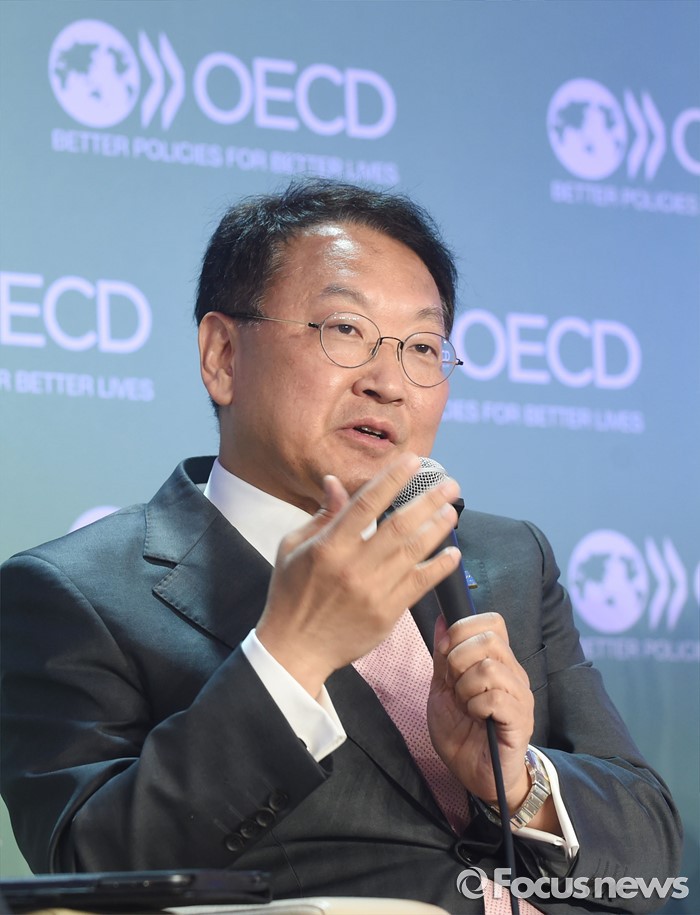 (서울=포커스뉴스) 유일호 부총리 겸 기획재정부 장관이 1일 프랑스 파리 OECD에서 열린 '2016년 OECD 각료이사회'에 참석, 고위급 패널토론에서 주제인 '성장을 위한 새로운 과제'와 관련 토론하고 있다. <사진제공=기획재정부>