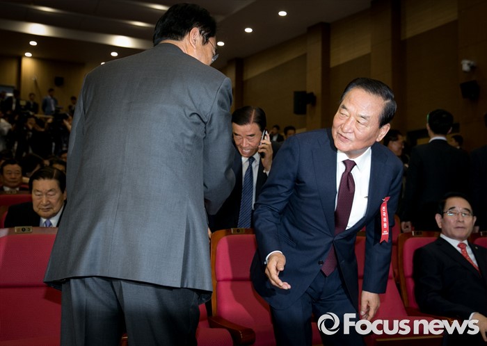 (서울=포커스뉴스) 2일 오후 서울 여의도 국회 의원회관에서 열린 새누리당 4차 전국위원회에 참석한 정진석(왼쪽) 원내대표와 서청원(가운데) 전 최고위원이 인사하고 있다.
