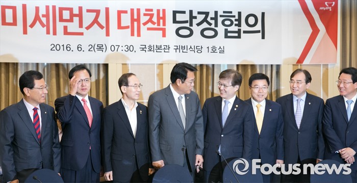 (서울=포커스뉴스) 2일 오전 서울 여의도 국회 귀빈식당에서 열린 미세먼지 대책 관련 당정협의에 참석한 의원들과 장, 차관들이 취재진을 향해 포즈를 취하고 있다. 왼쪽부터 이현재, 이명수 의원, 윤성규 환경부 장관, 정진석 원내대표, 최양희 미래창조과학부 장관, 김광림 정책위의장, 이석준 국무조정실장, 김상훈 의원.