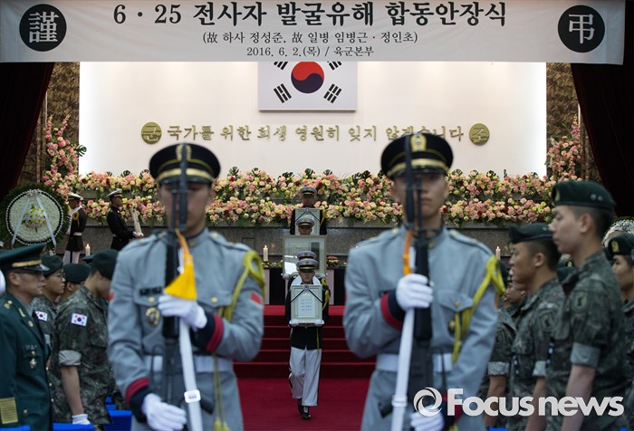 (대전=포커스뉴스) 2일 오전 대전 유성구 국립대전현충원에서 6.25 전쟁 전사자 발굴유해 3위(位) 합동안장식이 거행되고 있다.