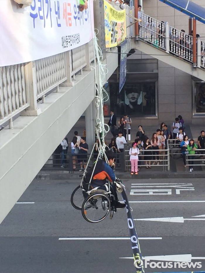 (서울=포커스뉴스) 경기420장애인차별철폐공동투쟁단 소속 회원이 2일 오후 경기도 수원역 앞 육교에서 장애인차별철폐 10대 요구안 이행을 촉구하는 고공시위를 벌이고 있다. <사진=독자 제공>