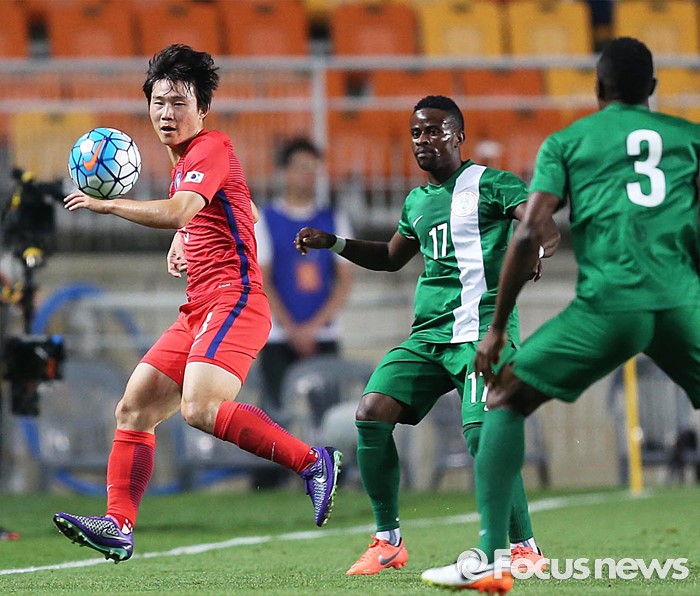 (수원=포커스뉴스) 2일 오후 경기 수원월드컵경기장에서 열린 2016 4개국 올림픽국가대표 축구대회 대한민국과 나이지리아의 경기에서 대한민국 이슬찬이 상대선수와 볼 경합을 하고 있다.