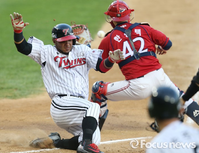 (서울=포커스뉴스) 2일 서울 잠실구장에서 열린 2016 프로야구 KIA-LG 경기 3회말 1사 2,3루에서 LG 채은성의 좌전 적시타때 2루주자 히메네스가 슬라이딩하며 홈인하고 있다.