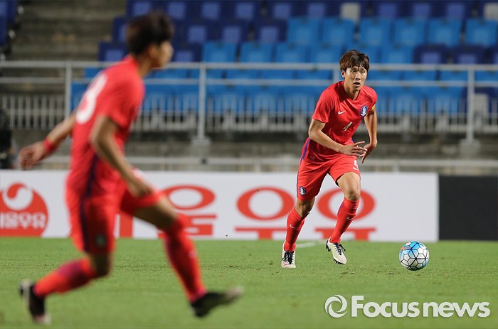 (수원=포커스뉴스) 2일 오후 경기 수원월드컵경기장에서 열린 2016 4개국 올림픽국가대표 축구대회 대한민국과 나이지리아의 경기에서 대한민국 송주훈이 드리블을 하고 있다.
