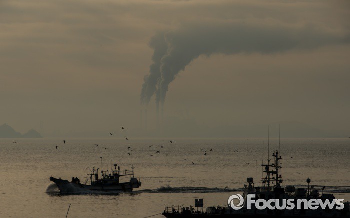 (안산=포커스뉴스) 경기도 안산시 풍도에서 바라본 충남 당진의 한 화력발전소의 굴뚝에서구름같은 수증기가 나오고 있다. 정부는 3일 미세먼지 대책발표에서 노후된 화력발전소의 설비를 교체하기로 가닥을모으고 있다.