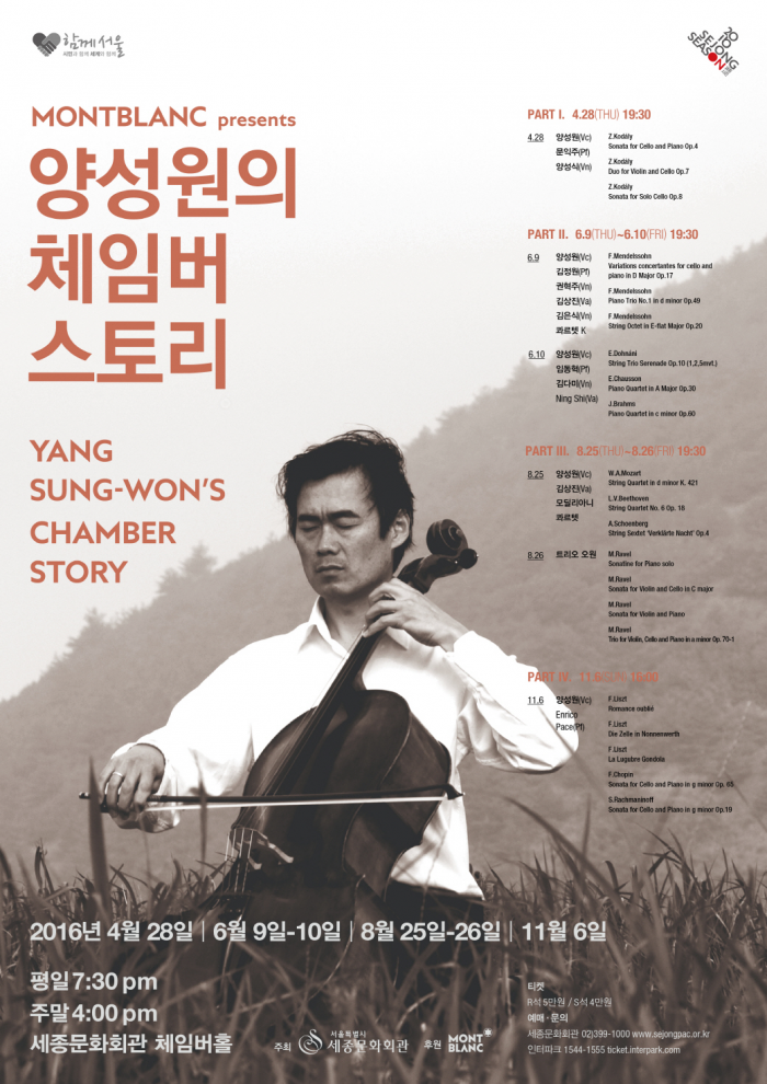 첼리스트 양성원은 국제적인 솔리스트, 전문 연주자로서 세계 굴지의 유명 연주장의 공연에서 호평을 받았다. 파리 음악원과 인디애나 대학에서 수학해 최고연주자 과정을 취득했으며, 명 첼리스트 야노스 슈타커의 애제자로 그의 조수를 역임했다. 현재 연세대 음대 교수이자 영국 런던의 로얄 아카데미 오브 뮤직의 초빙교수로 재직 중이다.'양성원의 체임버 스토리 Part.Ⅱ' 포스터.<사진제공=세종문화회관>