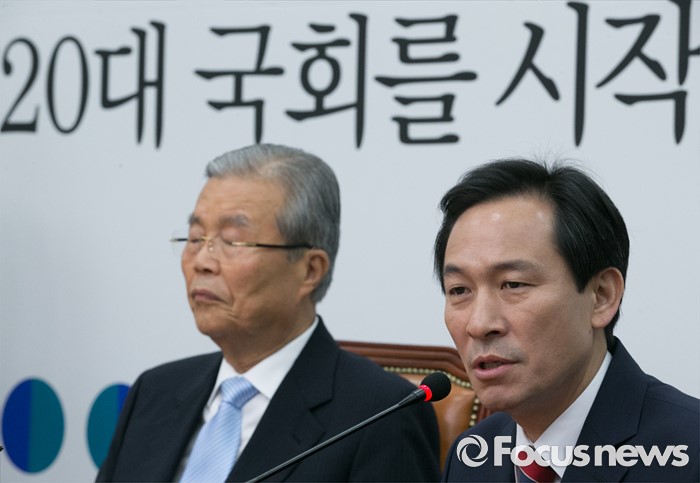 (서울=포커스뉴스) 3일 오전 서울 여의도 국회에서 열린 더불어민주당 비상대책위원회의에 참석한 우상호 원내대표가 발언을 하고 있다. 왼쪽은 김종인 비대위 대표.