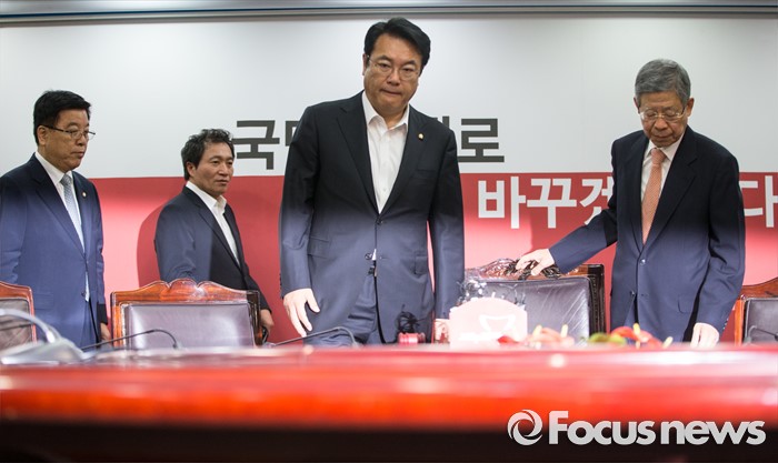 (서울=포커스뉴스) 김희옥(오른쪽) 새누리당 비상대책위원장과 정진석(왼쪽 세번째) 원내대표가 3일 오전 서울 여의도 새누리당 당사에서 열린 첫 비상대책위원회의에 참석하고 있다.