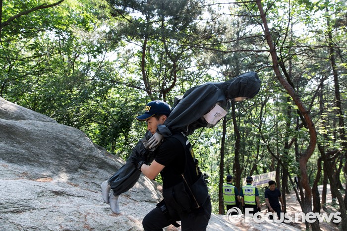 (서울=포커스뉴스) 지난 29일 서울 노원구 수락산 등산로에서 60대 여성을 살해한 피의자 김학봉(61)에 대한 현장검증이 열린 3일 오전 한 경찰 관계자가 피해자 마네킹을 들고 범행현장으로 향하고 있다.
