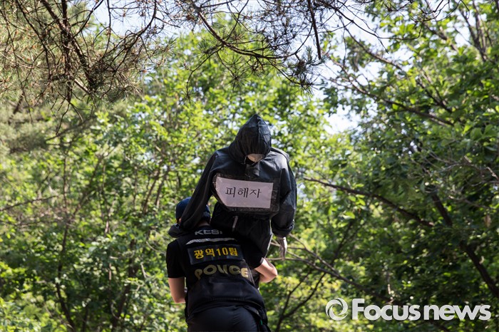 (서울=포커스뉴스) 지난 29일 서울 노원구 수락산 등산로에서 60대 여성을 살해한 피의자 김학봉(61)에 대한 현장검증이 열린 3일 오전 한 경찰 관계자가 피해자 마네킹을 들고 범행현장으로 향하고 있다.