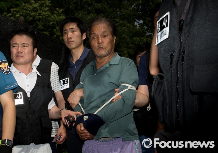 (서울=포커스뉴스) 지난 29일 서울 노원구 수락산 등산로에서 60대 여성을 살해한 피의자 김학봉(61)이 3일 오전 범행장소에서 현장검증을 마치고 호송차로 향하고 있다.