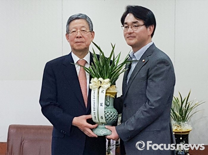 (서울=포커스뉴스) 김희옥(왼쪽) 새누리당 혁신비대위원장이 3일 오전 서울 여의도 당사에서 박용진 더불어민주당 당대표비서실장으로부터 김종인 비대위 대표가 보낸 축하난을 전달받고 있다.