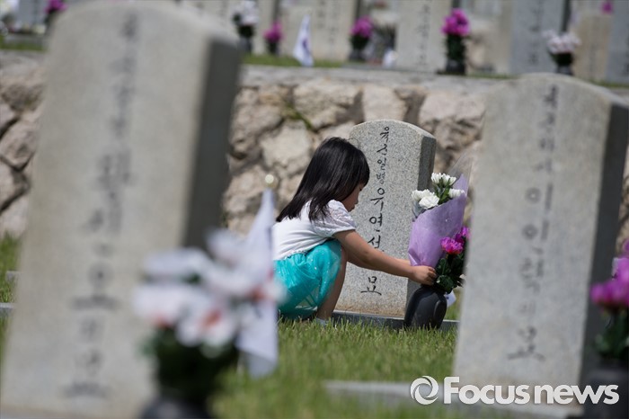 (서울=포커스뉴스) 현충일을 사흘 앞둔 3일 오전 서울 동작구 국립서울현충원에서 한 어린이가 국가유공자묘역을 찾고 있다.