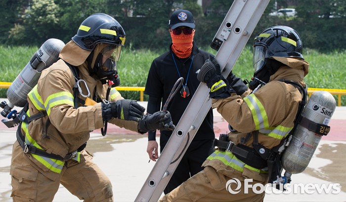 (청주=포커스뉴스) 3일 오전 충북 청주 무심천시민체육공원에서 열린 충북소방기술경연대회에 참가한 소방대원들이 기량을 겨루고 있다.