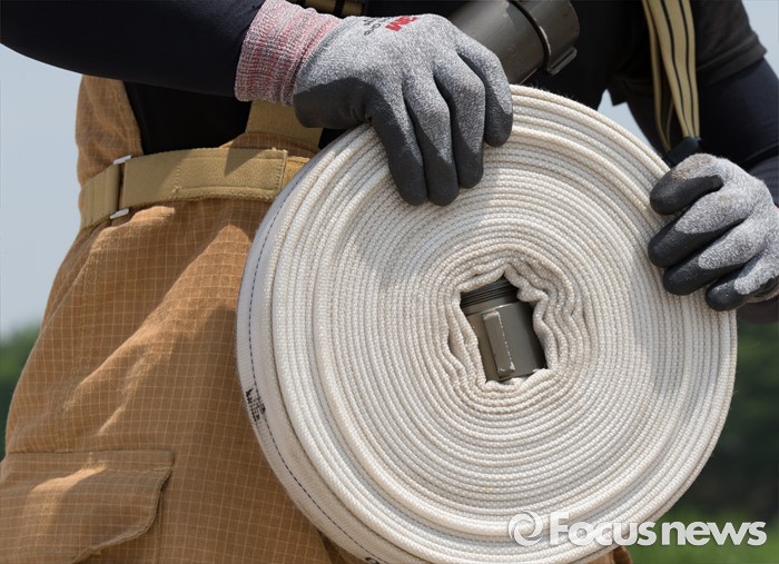 (청주=포커스뉴스) 3일 오전 충북 청주 무심천시민체육공원에서 열린 충북소방기술경연대회에 참가한 소방대원들이 경기에 사용될 호스를 준비하고 있다.