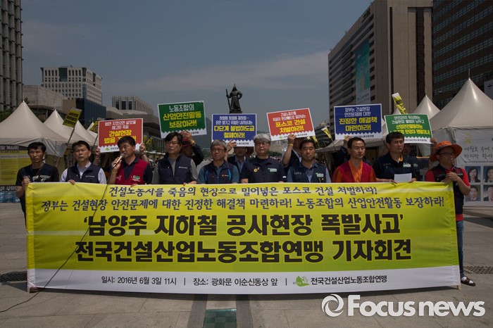 (서울=포커스뉴스) 3일 오전 서울 종로구 광화문광장에서 건설산업연맹원들이 남양주 지하철 폭발 및 붕괴사고에 대해 책임자 처벌과 건설현장 안전문제 대책 마련을 촉구하며 기자회견을 하고 있다.