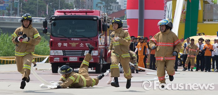(청주=포커스뉴스) 3일 오전 충북 청주 무심천시민체육공원에서 열린 충북소방기술경연대회에 참가한 소방대원들이 기량을 겨루고 있다.