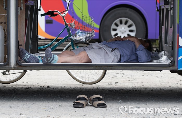 (세종=포커스뉴스) 최고 기온이 30도 가까이 오르며 초여름 날씨를 보인 3일 오후 세종시 정부세종청사 주차장에서통근버스 기사들이 트렁크에서 더위를 피해 휴식을 취하고 있다.