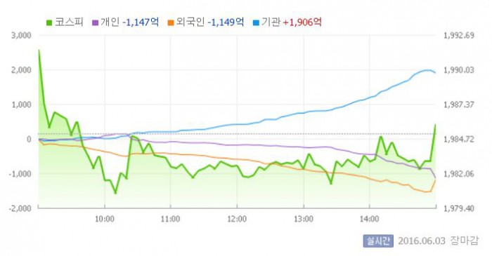 이날 코스피는 전일 대비 0.33% 상승한 1991.58에 장을 시작했다. 이후 지수는 외국인의 매도세에 밀려 장중 한때 1980선 초반까지 하락하기도 했다. 그러나 장 후반에 외국인이 매도 물량을 줄이고, 기관이 대규모 매수에 나서면서 강보합세로 거래를 마쳤다.