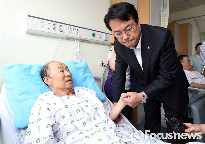 (서울=포커스뉴스) 정진석 새누리당 원내대표가 현충일을 사흘 앞둔 3일 오후 서울 강동구 중앙보훈병원을 방문해 DMZ지뢰로 발목을 다쳤던 환자를 위문하고 있다.