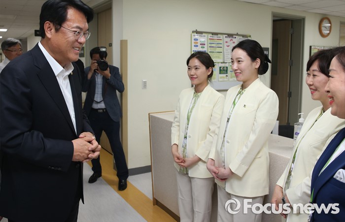 | △ 보훈병원 간호사들과 대화하는 정진석 |