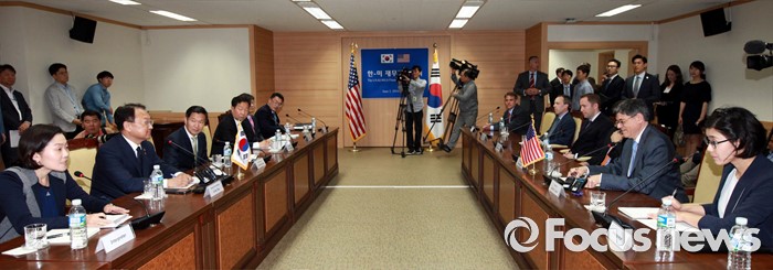 (서울=포커스뉴스) 3일 오후 종로구 정부서울청사에서 열린 한·미 재무장관회의에 참석한 유일호(왼쪽) 경제부총리 겸 기획재정부 장관과 제이콥 루(Jacob Lew) 미국 재무부 장관이 회의를 하고 있다.