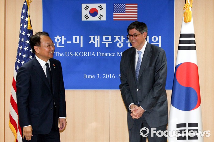 (서울=포커스뉴스) 3일 오후 종로구 정부서울청사에서 열린 한·미 재무장관회의에 참석한 유일호(왼쪽) 경제부총리 겸 기획재정부 장관과 제이콥 루(Jacob Lew) 미국 재무부 장관이 인사를 하고 있다.