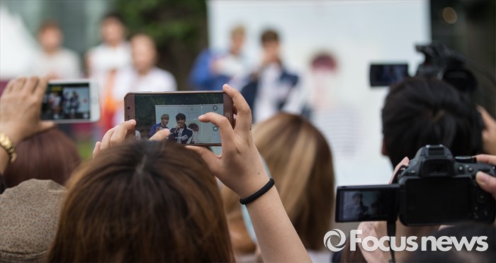 (서울=포커스뉴스) 3일 오후 서울 광진구 건대입구 스타시티 광장에서 가수 송유빈의 거리공연을 시민들이 촬영하고 있다.