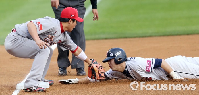 | △ 도루 실패하는 두산 박건우 |