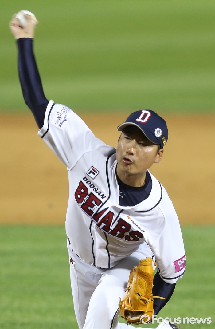 (서울=포커스뉴스) 3일 서울 잠실구장에서 열린 2016프로야구 SK-두산 경기에서 두산 투수 정재훈이 8회 등판해 투구하고 있다.