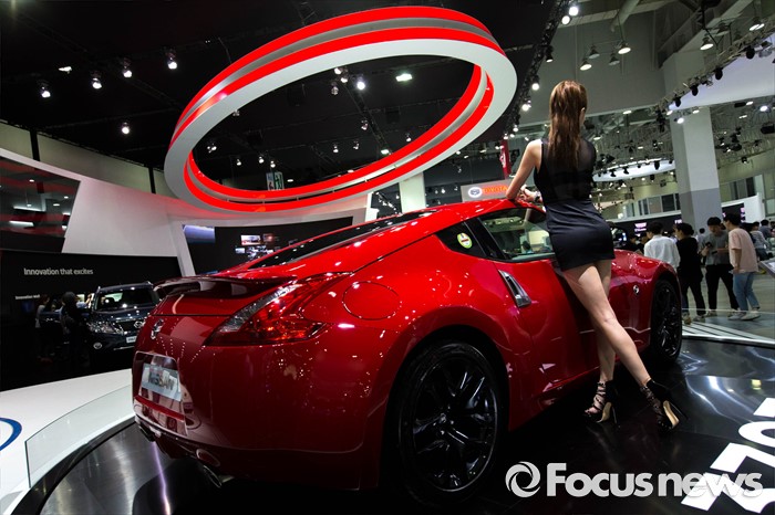 (부산=포커스뉴스) 3일 오후 부산 해운대구 벡스코에서 '2016 부산 국제모터쇼'가 공식 개막한 가운데 레이싱걸이 관람객들을 향해 포즈를 취하고 있다. 이번 국제모터쇼는 오는 12일 까지 계속 된다.