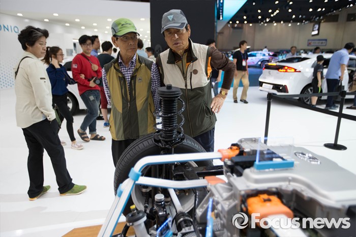 (부산=포커스뉴스) 3일 오후 부산 해운대구에 위치한 벡스코에서 열린 '2016 부산국제모터쇼'에서 관람객들현대 부스에 마련된 친환경 자동차 관련 기술을 살펴보고 있다.