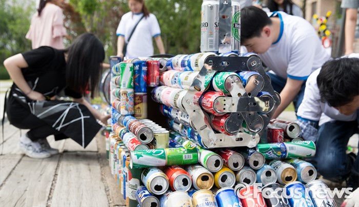 (서울=포커스뉴스) 4일 오후 서울 마포구 연남동 경의선 숲길에서 시민들이 버려진 음료캔으로 경의선 화물기차를 만들고 있다.