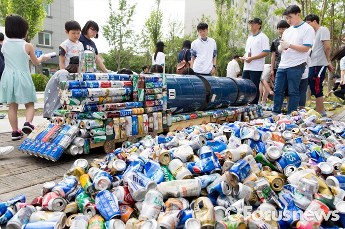 (서울=포커스뉴스) 4일 오후 서울 마포구 연남동 경의선 숲길에서 시민들이 버려진 음료캔으로 경의선 화물기차를 만들고 있다.