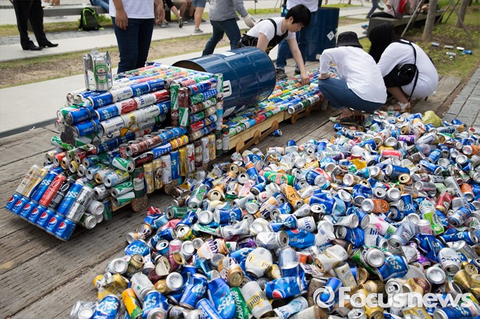 (서울=포커스뉴스) 4일 오후 서울 마포구 연남동 경의선 숲길에서 시민들이 버려진 음료캔으로 경의선 화물기차를 만들고 있다.
