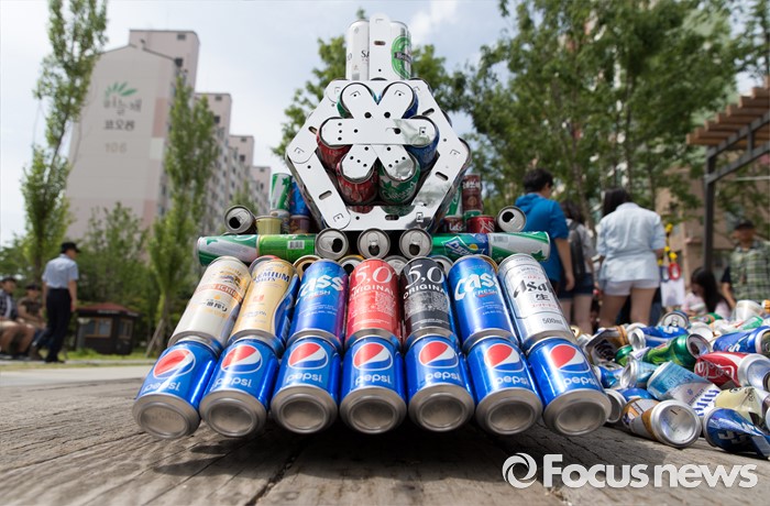 (서울=포커스뉴스) 4일 오후 서울 마포구 연남동 경의선 숲길에서 시민들이 버려진 음료캔으로 경의선 화물기차를 만들고 있다.