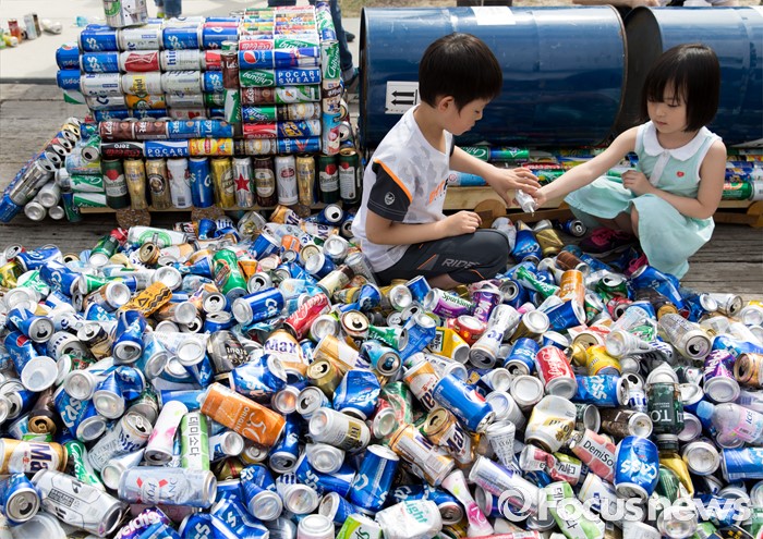 (서울=포커스뉴스) 4일 오후 서울 마포구 연남동 경의선 숲길에서 어린이들이 버려진 음료캔으로 경의선 화물기차를 만들고 있다.