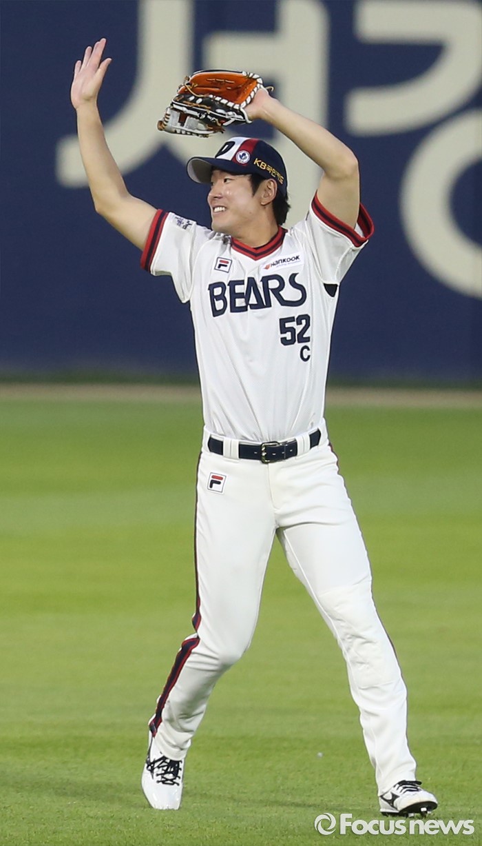 (서울=포커스뉴스) 5일 서울 잠실구장에서 열린 2016프로야구 SK-두산 경기에서 두산 유격수 김재호가 9회 SK 김민식의 플라이볼을 잡으며 경기를 끝내고 있다.