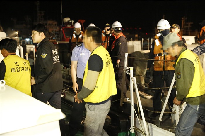 (서울=포커스뉴스) 6일 오전 인천해양경비안전서 전용부두에 서해 연평도 북방한계선(NLL) 인근에서 조업하다 우리 어민들에게 나포된 중국어선 선원들이 입국 후 조사를 위해 이동하고 있다. <사진제공=인천해경>
