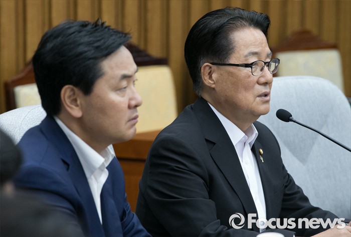 (서울=포커스뉴스) 6일 오전 서울 여의도 국회에서 박지원 국민의당 원내대표가 20대 국회 원구성 협상 등과 관련 기자간담회를 하고 있다. 왼쪽은 김관영 원내수석부대표.