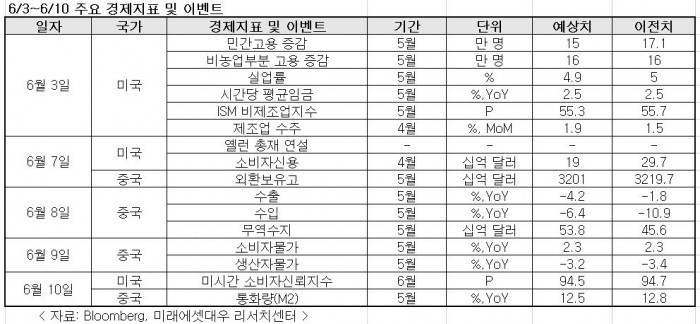 이번주 주목할 이벤트와 경제지표는 △중국 5월 수출 지표 △미국 6월 미시간 소비자신뢰지수 발표 등이 있다.