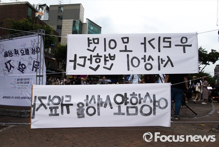 (서울=포커스뉴스) 6일 오후 서울 마포구 나루수산 앞 광장에서 열린 '여성 혐오에 저항하는 모두의 1차 공동행동-여성 혐오세상을 뒤엎자' 집회에 여성 혐오 규탄하는 현수막이 걸려 있다.