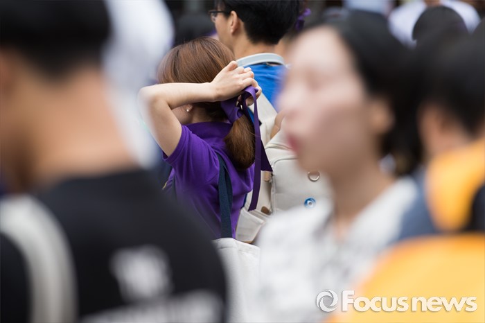 (서울=포커스뉴스) 6일 오후 서울 마포구 나루수산 앞 광장에서 열린 '여성 혐오에 저항하는 모두의 1차 공동행동-여성 혐오세상을 뒤엎자' 집회에 참석한 여성단체 회원이 머리에 보라색 리본을 매고 있다.