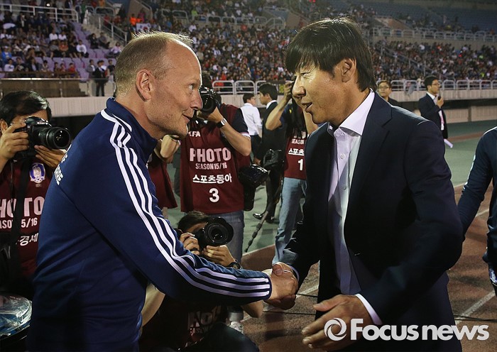 (부천=포커스뉴스) 6일 오후 경기 부천종합운동장에서 열린 2016 4개국 올림픽국가대표 축구대회 대한민국과 덴마크의 경기에서 대한민국 신태용 감독과 덴마크 닐슨 프레드릭센 감독이 경기 시작 전 악수하고 있다.