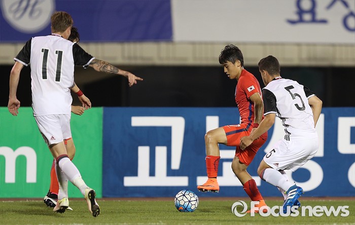 (부천=포커스뉴스) 6일 오후 경기 부천종합운동장에서 열린 2016 4개국 올림픽국가대표 축구대회 대한민국과 덴마크의 경기에서 대한민국 최경록이 상대 선수와 볼 다툼을 하고 있다.