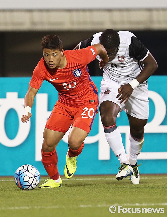 (부천=포커스뉴스) 6일 오후 경기 부천종합운동장에서 열린 2016 4개국 올림픽국가대표 축구대회 대한민국과 덴마크의 경기에서 대한민국 황희찬이 상대 선수와 볼 다툼을 하고 있다.