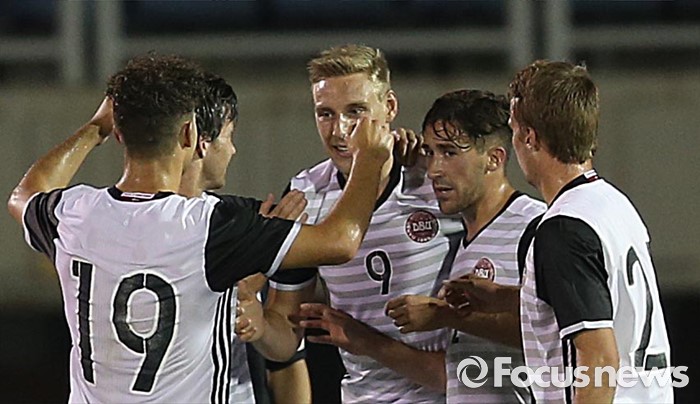 (부천=포커스뉴스) 6일 오후 경기 부천종합운동장에서 열린 2016 4개국 올림픽국가대표 축구대회 대한민국과 덴마크의 경기에서 덴마크 니콜라이 복메슨이 동점골을 성공시킨 후 동료들과 환호하고 있다.