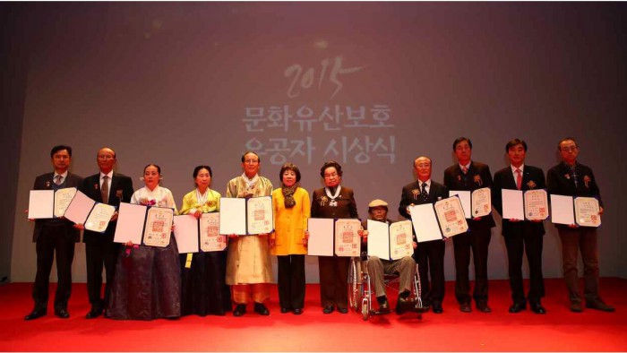 문화재청은 9월부터 접수된 추천 후보자에 대한 경력조회, 외부 전문가로 구성된 심사위원회의 평가 등의 절차를 거쳐 최종 후보자를 선정한다. 이어 일반 국민을 대상으로 한 공개 검증을 거친 뒤 12월8일 시상식을 개최할 예정이다.2015년도 문화유산보호 유공자 시상식 모습. <사진제공=문화재청>