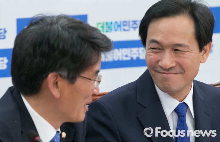 (서울=포커스뉴스) 7일 오전 서울 여의도 국회에서 열린 더불어민주당 원내대책회의에 참석한 우상호(오른쪽) 원내대표와 박완주 원내수석부대표가 대화하고 있다.
